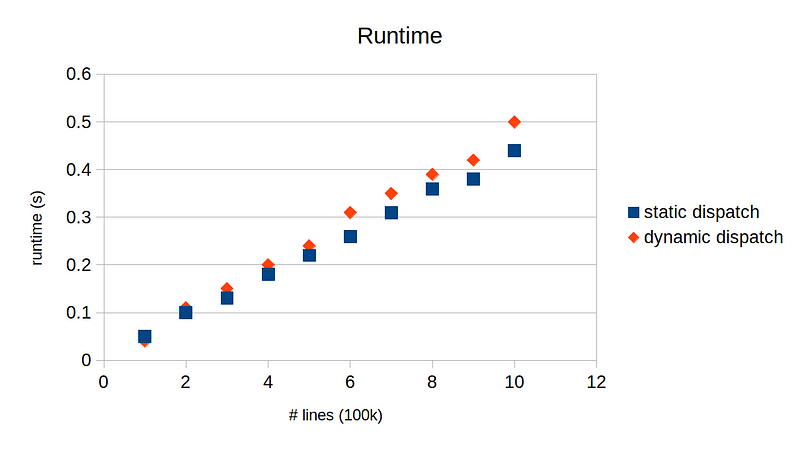 We can clearly see that static dispatch requires fewer instructions. In general, fewer instructions translate to more efficient program provided all other conditions being equal. We can also measure the runtime difference of the two: